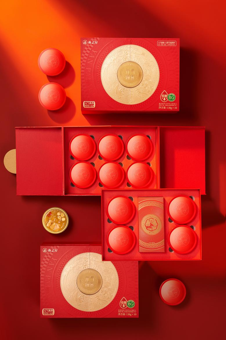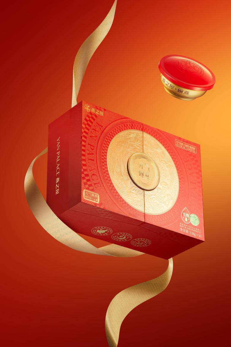 碗燕·元氣款采用中國紅與黃金色系的精美配搭,凸顯光亮色澤與尊貴質感,大方得體,有禮有面,作為母親節禮物盡顯尊貴格調。禮盒設計圍繞“圓”的概念,以年輪為設計意象,象征歲月賦予的智慧,也傳遞著圓滿之意。盒上刻畫金燕反哺動人圖景,祥云繁花環繞其中,蘊藏濃厚情意。獨特的對稱開盒頗具巧思與創意,內里雙層設計,共承十碗珍饈碗燕·元氣款,滿載濃濃營養與深切關懷,讓滋補觸手可及,關愛無處不在。