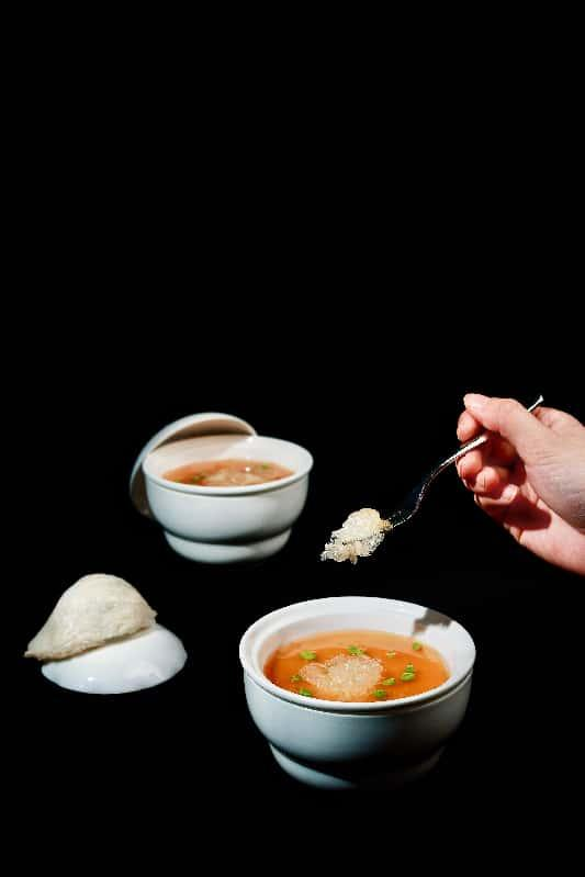 芙蓉糟溜燕菜,升級傳統“糟溜”手法,同時融入西式元素,彈潤透亮燕窩浸染陳年酒糟的馥郁,與潔白蛋清碰撞出形式芙蓉的絕妙色彩,入口酒香沁脾,燕絲纏綿,帶來別具一格的舌尖體驗。酒糟氣息悠悠升騰,融合在一匙間完成,既保留了“酒香入菜”的傳統精髓,也表達了現代美學語境下的“輕盈與克制”。
